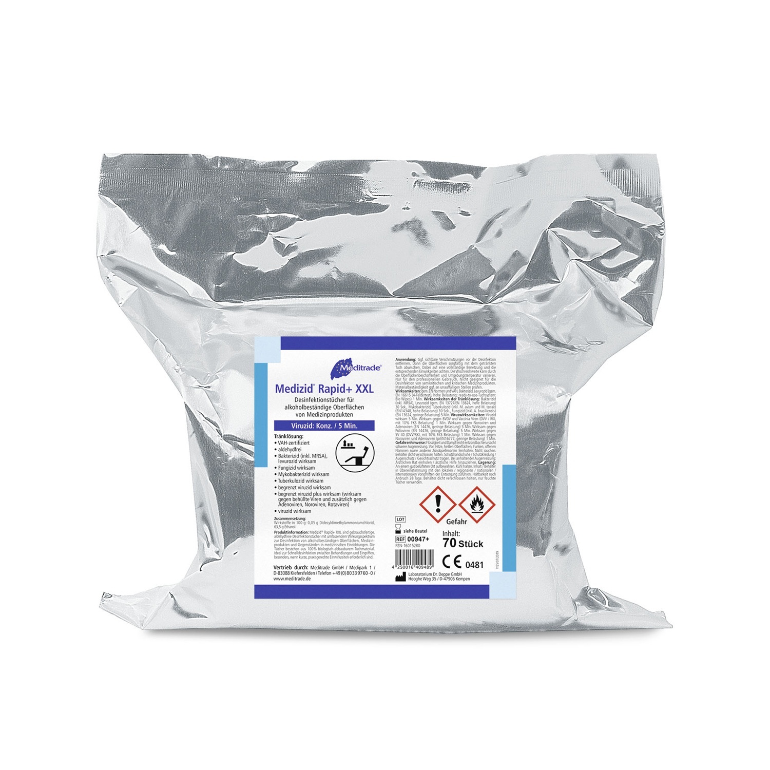 Leistungsstarkes, gebrauchsfertiges Schnelldesinfektionsmittel für alkoholbeständige Flächen und Gegenstände. MEDIZID RAPID+ Tücher wirken bakterizid, fungizid, tuberkulozid (inkl. M.-terrae), begrenzt viruzid und sind damit umfassend wirksam gegen alle behüllten Viren (BVDV/Vaccinia inkl. HBV, HIV, HCV). Darüber hinaus wirken MEDIZID RAPID+ Tücher gegen Rota- und Noroviren.