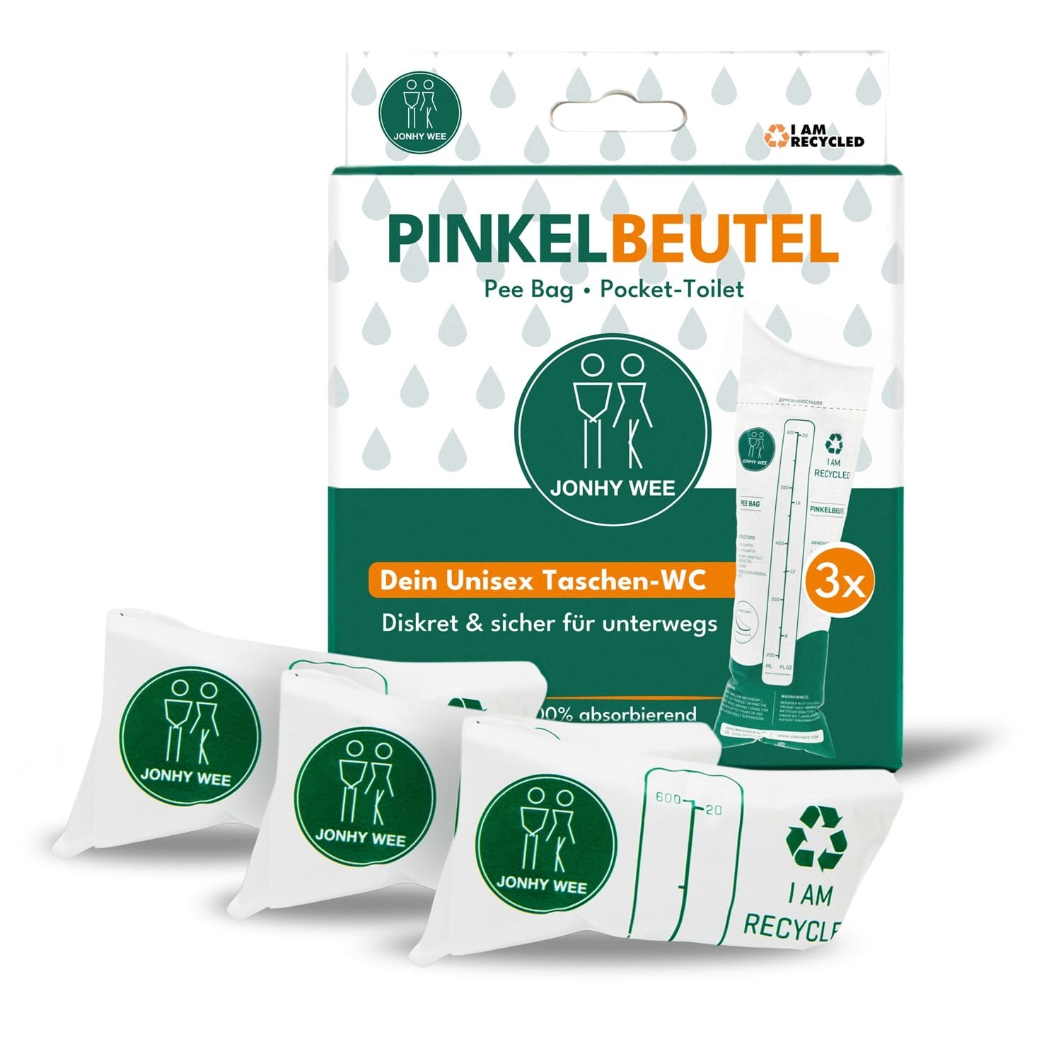 Jede Verpackung enthält 3 Pinkelbeutel, die problemlos in Deine Hosentasche, Handtasche oder ins Handschuhfach passen.