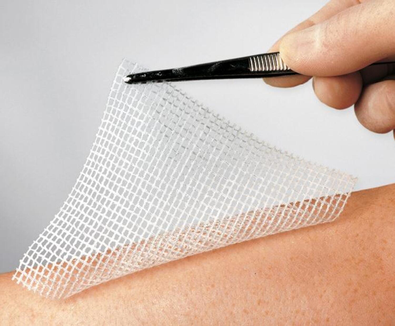 Die Wundauflage ist auf beiden Seiten mit Pergamentpapier abgedeckt.