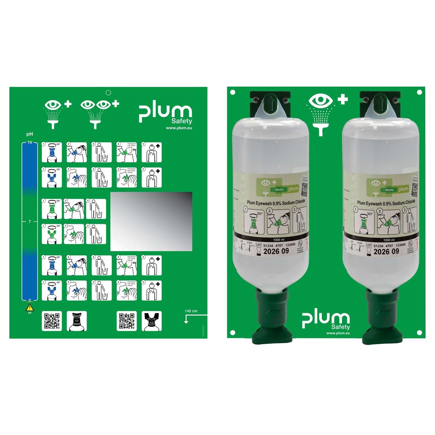 Plum Augenspülstation 4708 mit zwei Augenspülflaschen mit 1000 ml steriler Natriumchloridlösung (0,9%). Mit zwei Wandhalterungen und beiliegendem Piktogramm. Die Station ist zusätzlich mit einem Spiegel ausgestattet und ermöglicht eine besonders korrekte und schnelle Spülung an Arbeitsplätzen, wo eine sehr lange Spülzeit erforderlich ist.